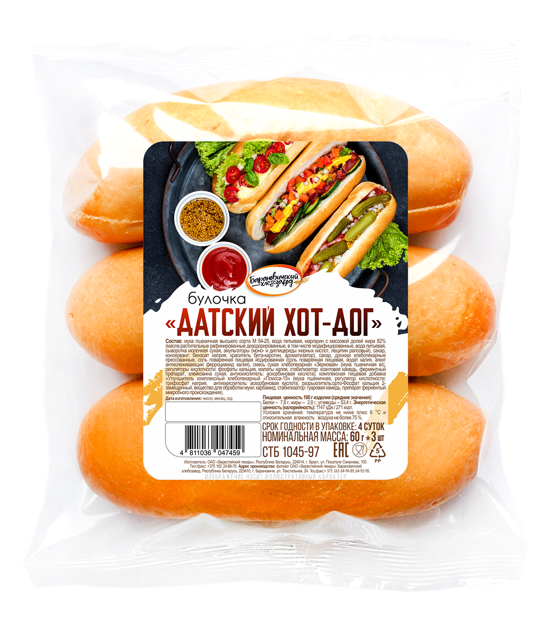 Булочка для «Датский хот-дог» — сдобное булочное изделие вырабатываемое из муки пшеничной высшего сорта, с добавлением маргарина, сахара, смеси сухой хлебопекарной «Зерновая», дрожжей хлебопекарных и другого сырья