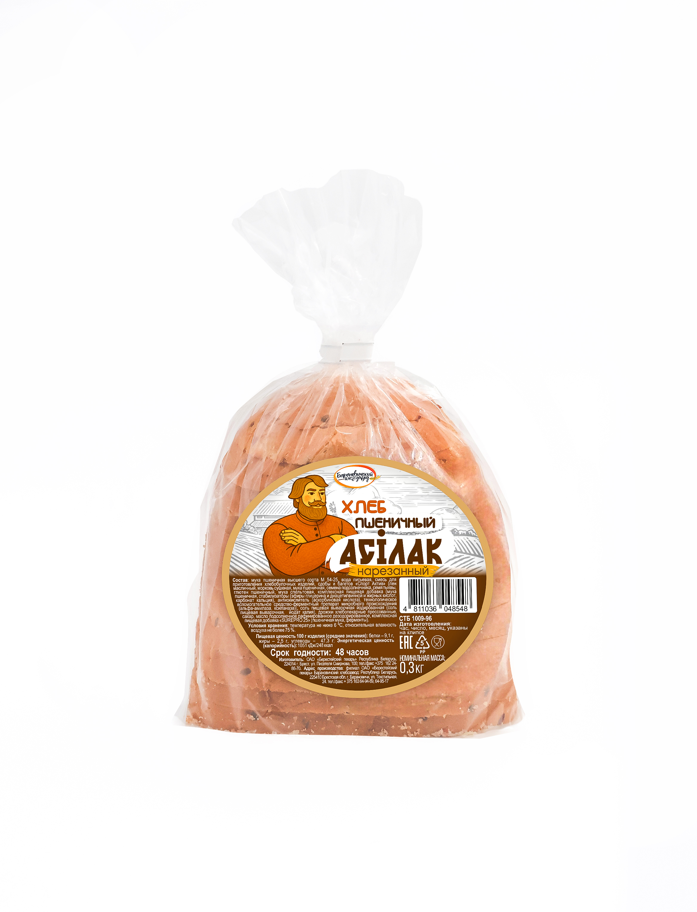 Хлеб пшеничный «Асiлак» — представляет собой хлебобулочное изделие, вырабатываемое из муки пшеничной первого сорта с добавлением смеси для приготовления хлебобулочных изделий, сдобы и багетов «Спорт Актив», дрожжей хлебопекарных прессованных, соли поваренной йодированной, сахара, масла подсолнечного рафинированного дезодорированного, комплексной пищевой добавки «Surepro 25»