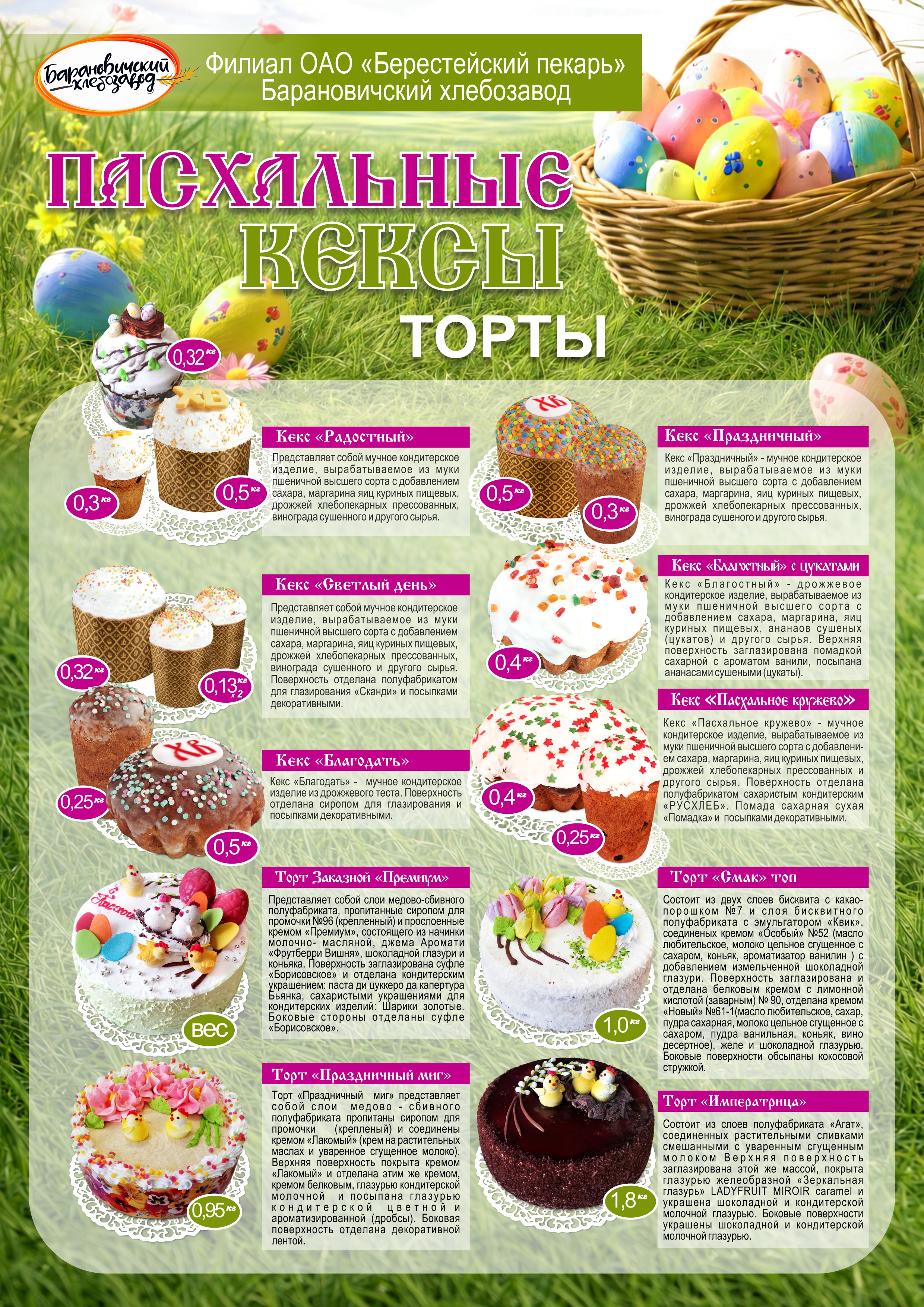 Предлагаем Вам ассортимент пасхальных изделий, который Барановичский хлебозавод подготовил для реализации в канун праздников с 06 по 12 апреля