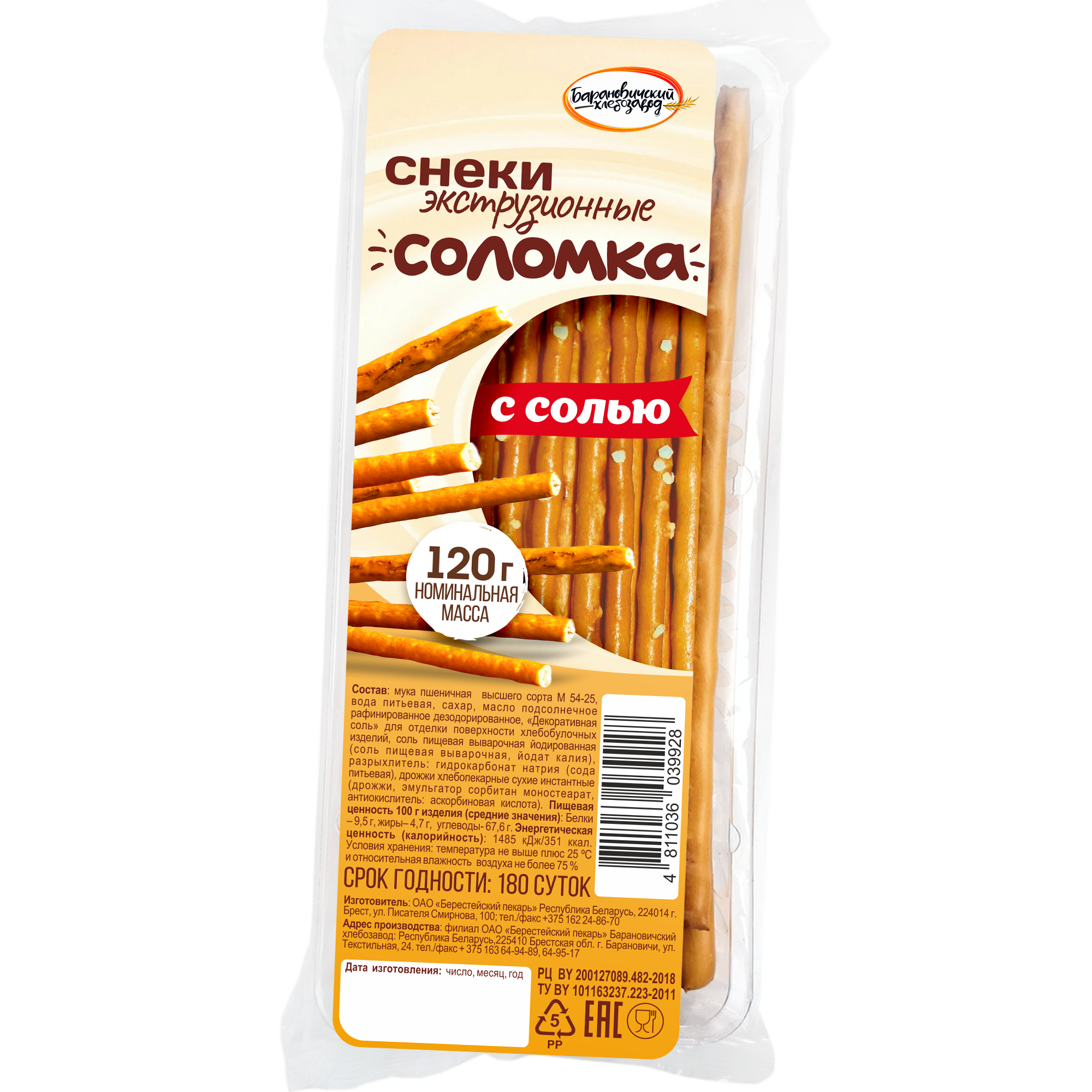 Снеки экструзионные «Соломка»  представляют собой изделие, изготовленное методом экструзии низкого давления  из муки пшеничной высшего сорта, сахара, масла подсолнечного рафинированного дезодорированного, сухих дрожей и другого сырья.